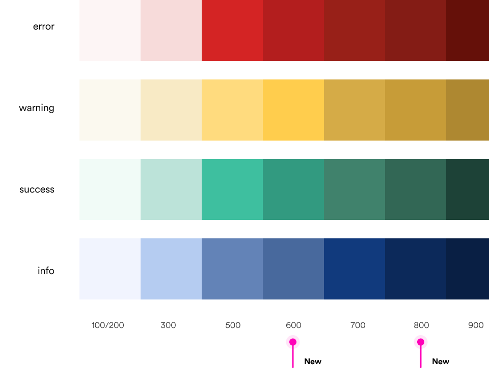 Our feedback palettes (success, warning, error, info) each had only 5 shades, while our brand palettes had 10. That gap was compounding the limitations of our chip component. I proposed adding 2 shades to each feedback palette and worked with the Design System Lead to get the feedback palette and chip component update in the system.