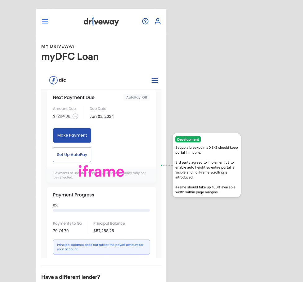 Both paths ended in the same place: the DFC payment portal rendered in an iframe inside My Driveway, with the account relationship handled quietly in the background.