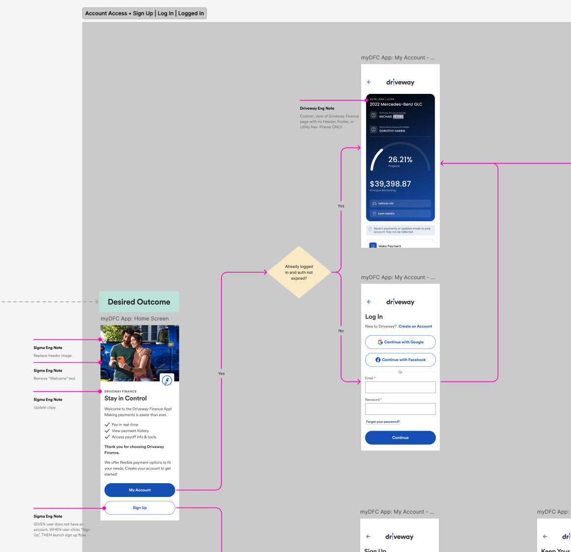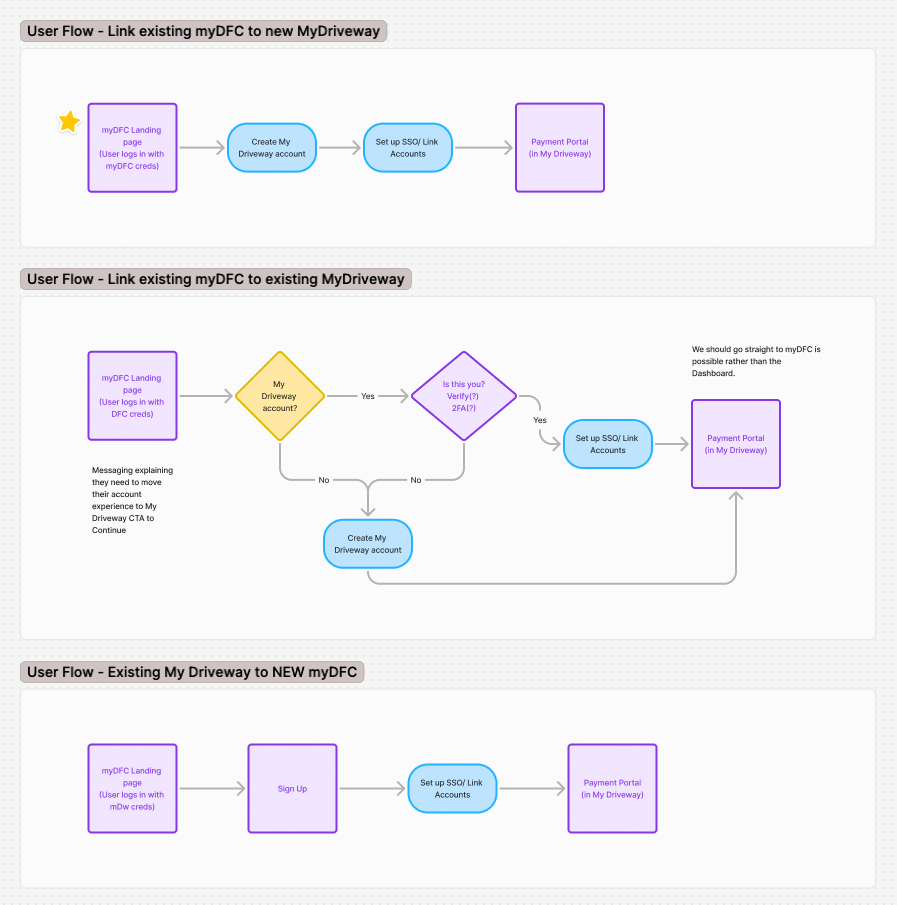 DFC customers who had never used Driveway.com were coming in cold. They were used to opening an app, typing a username and password, and getting to their payment portal. The new flow asked them to create a My Driveway account first, look up their loan, and let the system handle the account connection in the background before surfacing the portal. A lot of steps for someone who just wants to make a car payment. The connection had to feel like a feature, not a detour.